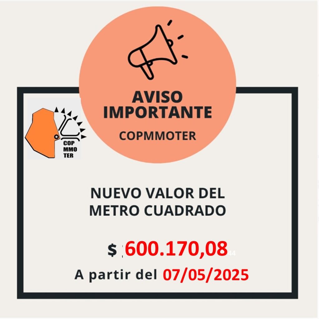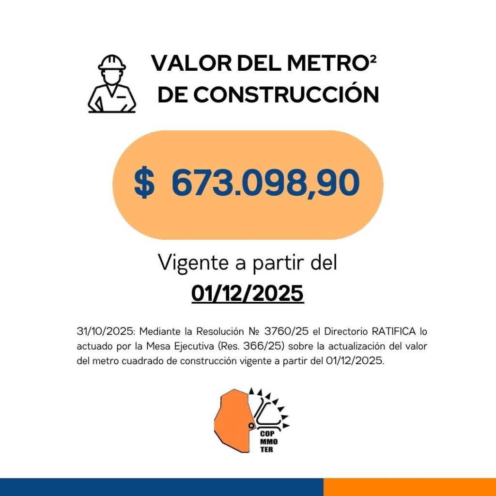 El 31 de octubre de 2025, la Mesa Ejecutiva del COPMMOTER dispuso actualizar el costo del metro cuadrado (m²) de construcción, debido a la variación económica del país y a solicitudes de matriculados/as. Se tomó como base el valor previo de febrero 2025, ajustándolo a septiembre 2025, aplicando índices del INDEC junto con coeficientes establecidos por normativa vigente.
